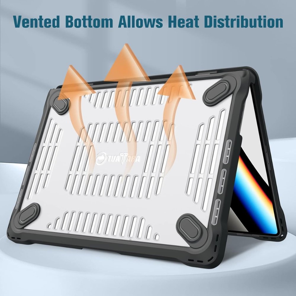 Strategic ventilation channels align with your MacBook Pro’s cooling vents — ensuring proper airflow and heat dissipation during intensive tasks like video editing, coding, or running heavy applications. Your MacBook Pro runs at optimal temperature with the case on — no thermal throttling, no overheating concerns.